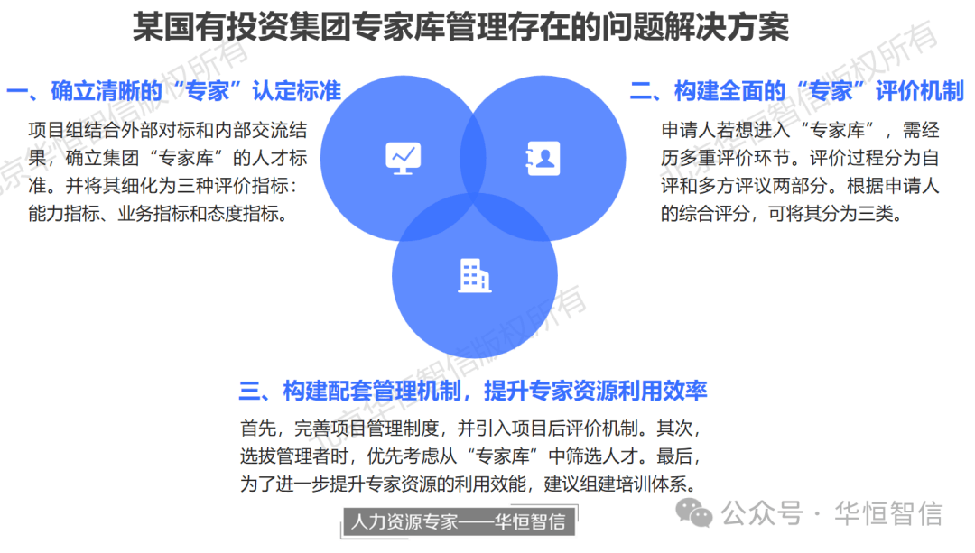 针对以上问题,华恒智信的专家顾问团队经过对集团的深入调研分析,结合多年的经验积累,分析集团当前专家库建设过程中存在的阻力与问题,提出了以下针对性的解决建议。